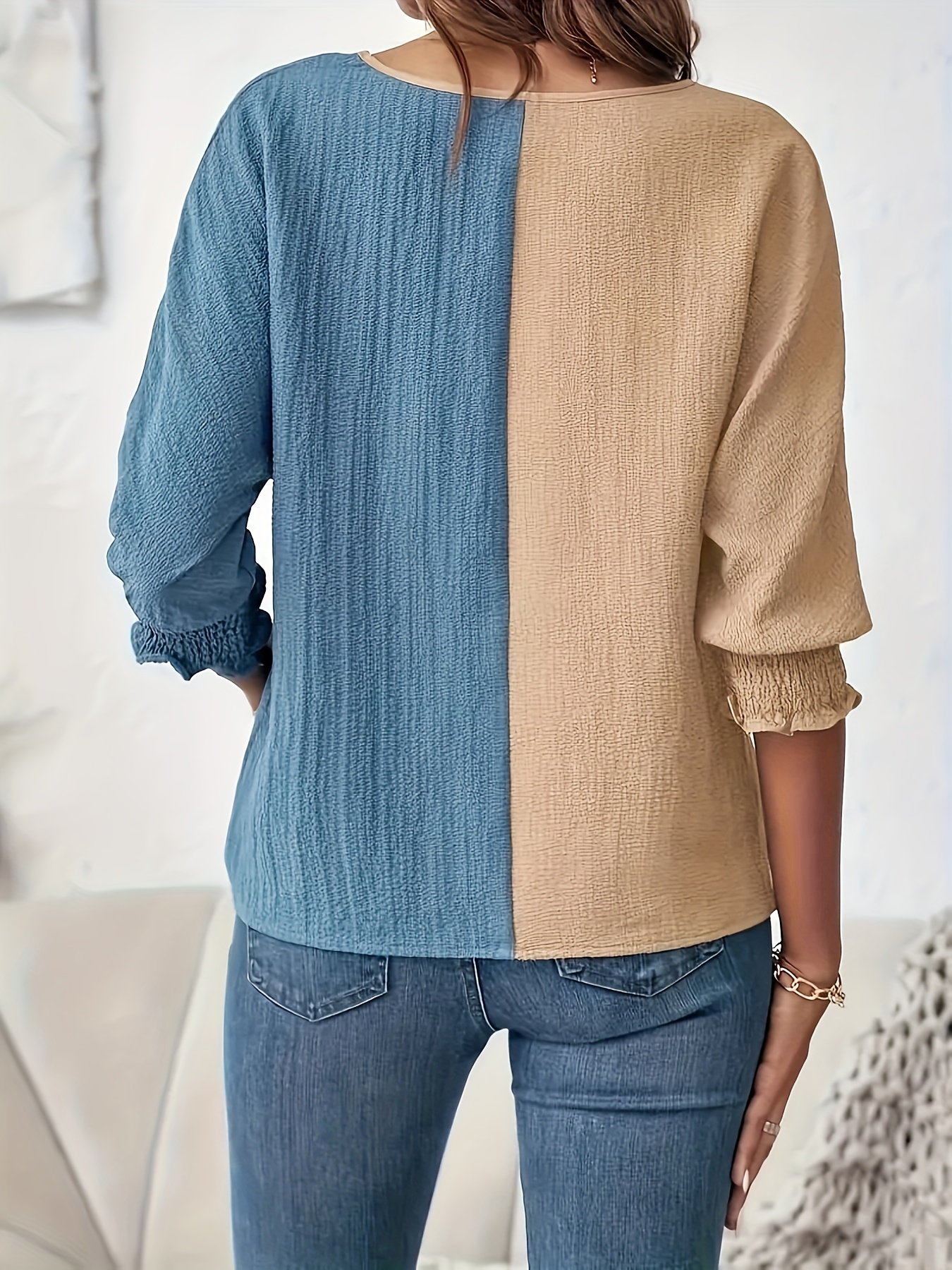 Elegant Color Block V-Neck Blouse for Women - Breathable Polyester, Machine Washable - Perfect for Spring/Summer/Fall