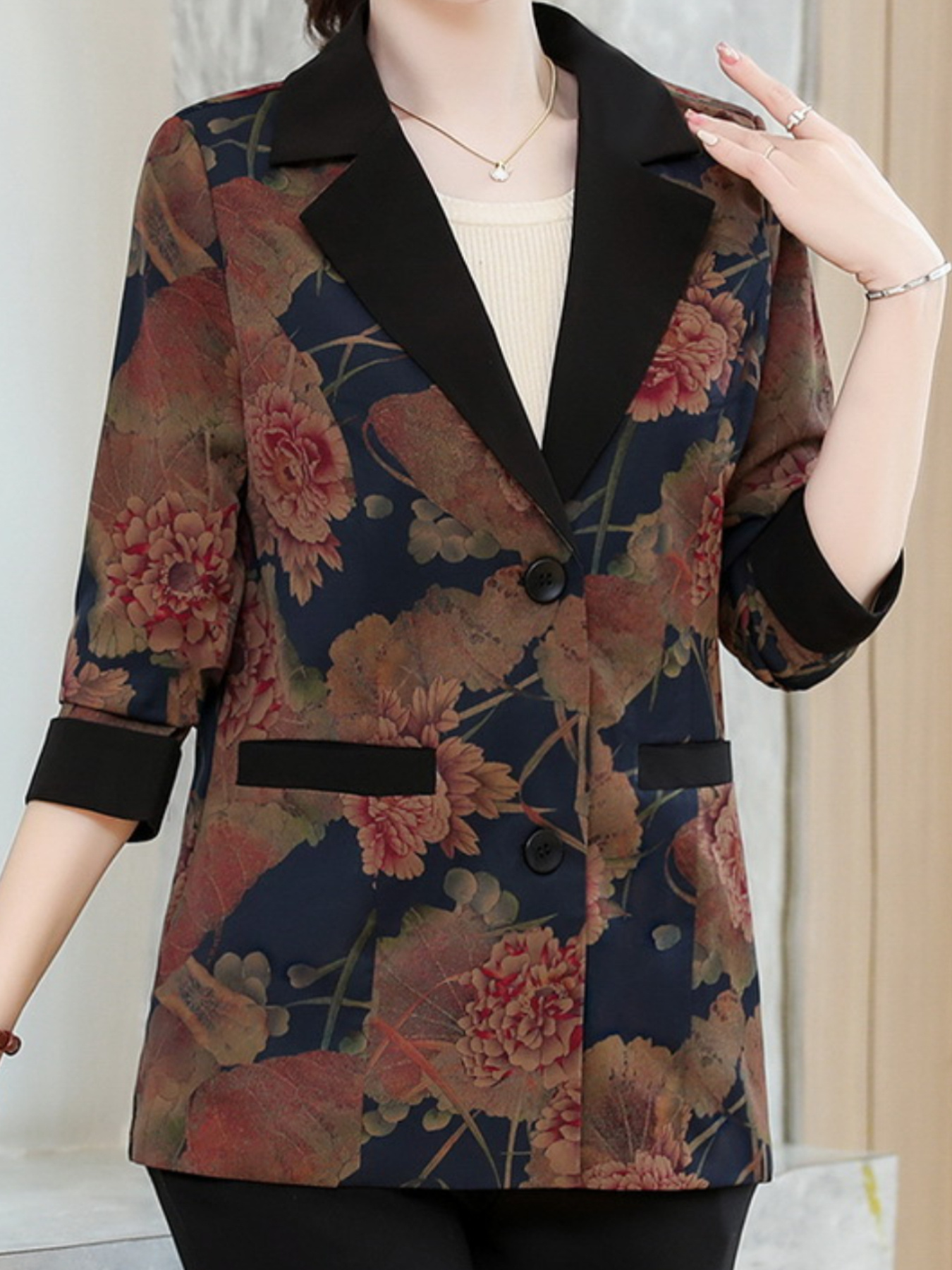Plus Size, Scacto Women's Vintage Floral print Blazer Jacket - Elegant Lapel Collar & Belted Waist, Single-Button Front, Dropped Shoulder - Winter Formal Party Wedding Attire, Hand Washable Statement Piece for Special Occasions