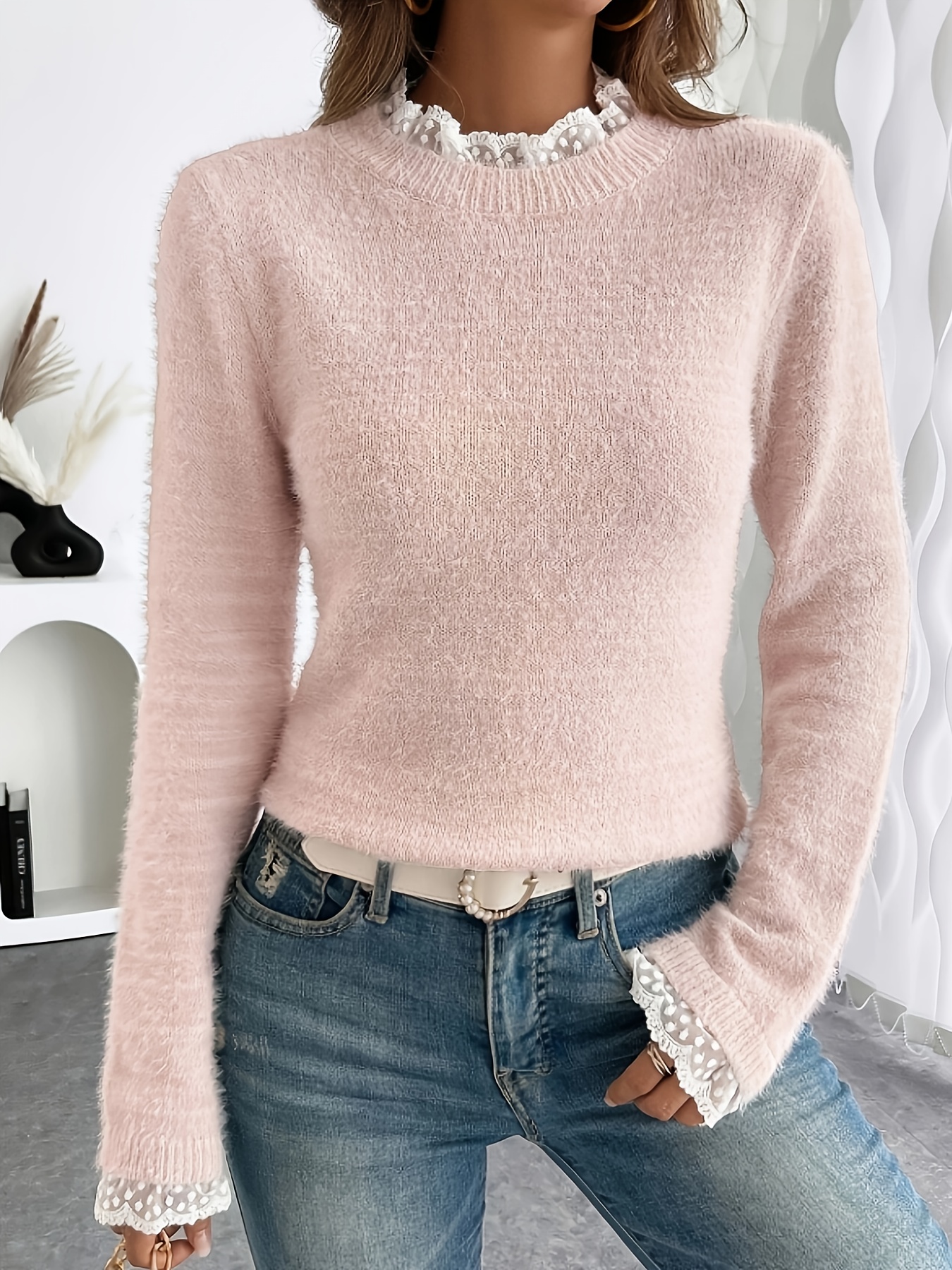 Women's Elegant Round Neck Sweater with Lace Detail on Collar and Cuffs
