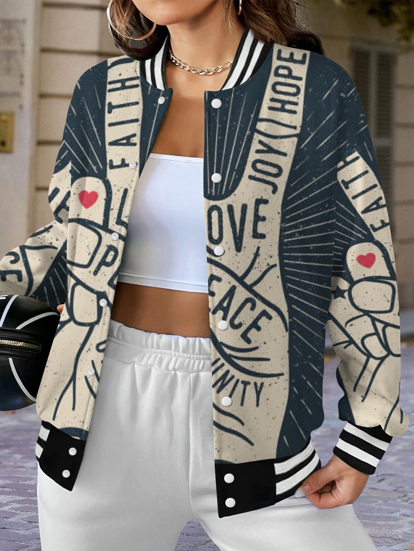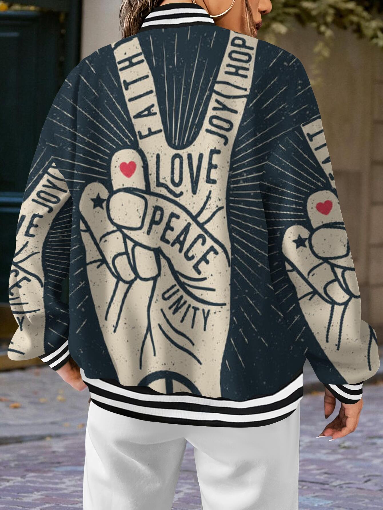 Women'S Plus Size Retro 70s Hippie Style Jacket - Faith Love Joy Unity & Peace Signs 3D Print, Machine Washable Winter Warm Coat with Stand Collar