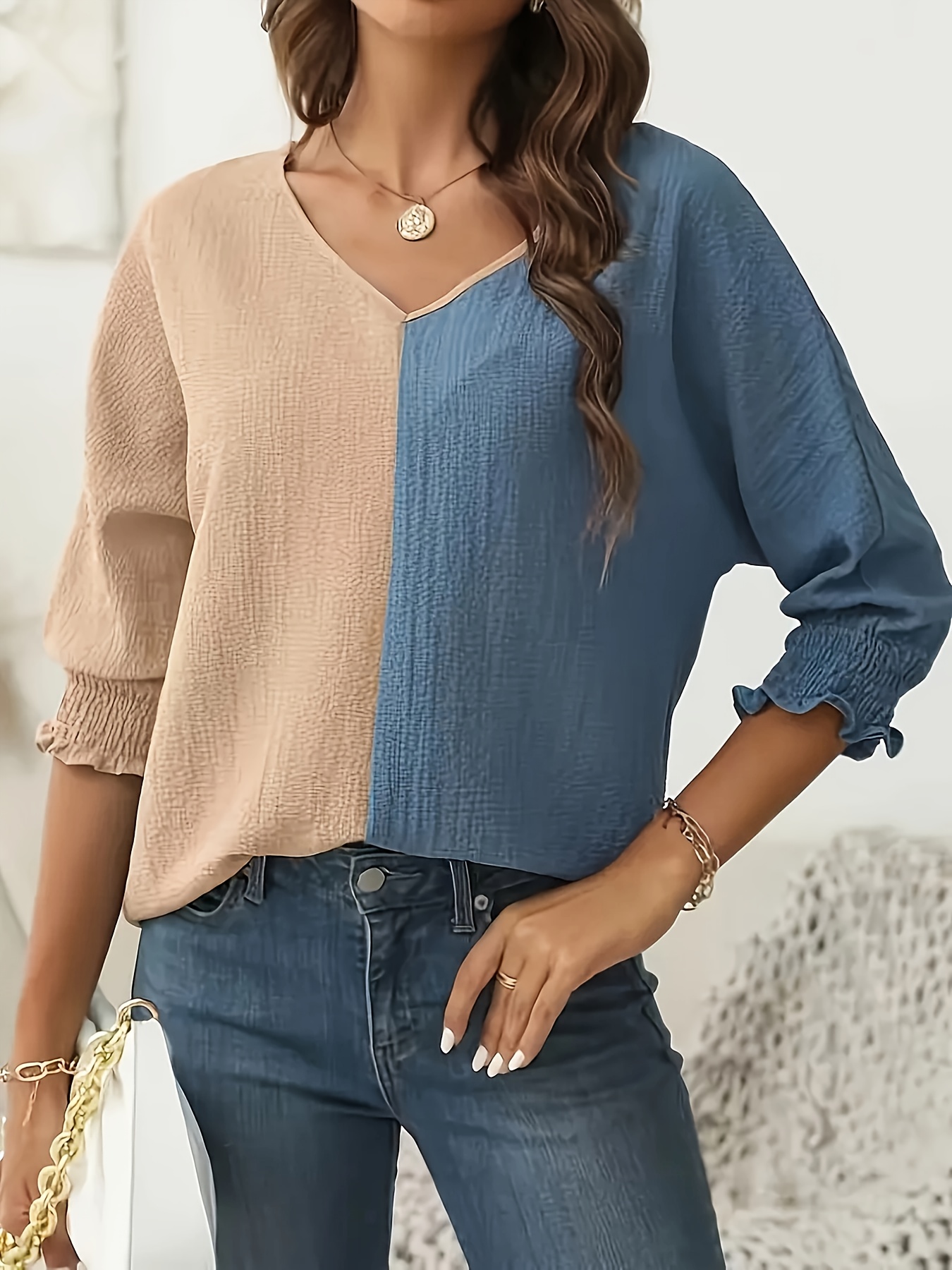 Elegant Color Block V-Neck Blouse for Women - Breathable Polyester, Machine Washable - Perfect for Spring/Summer/Fall