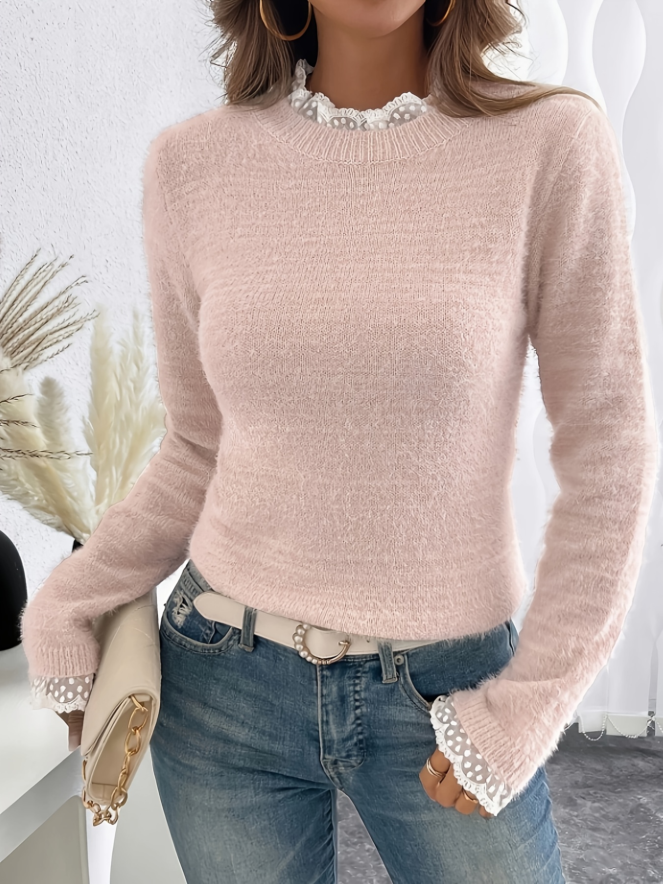 Women's Elegant Round Neck Sweater with Lace Detail on Collar and Cuffs