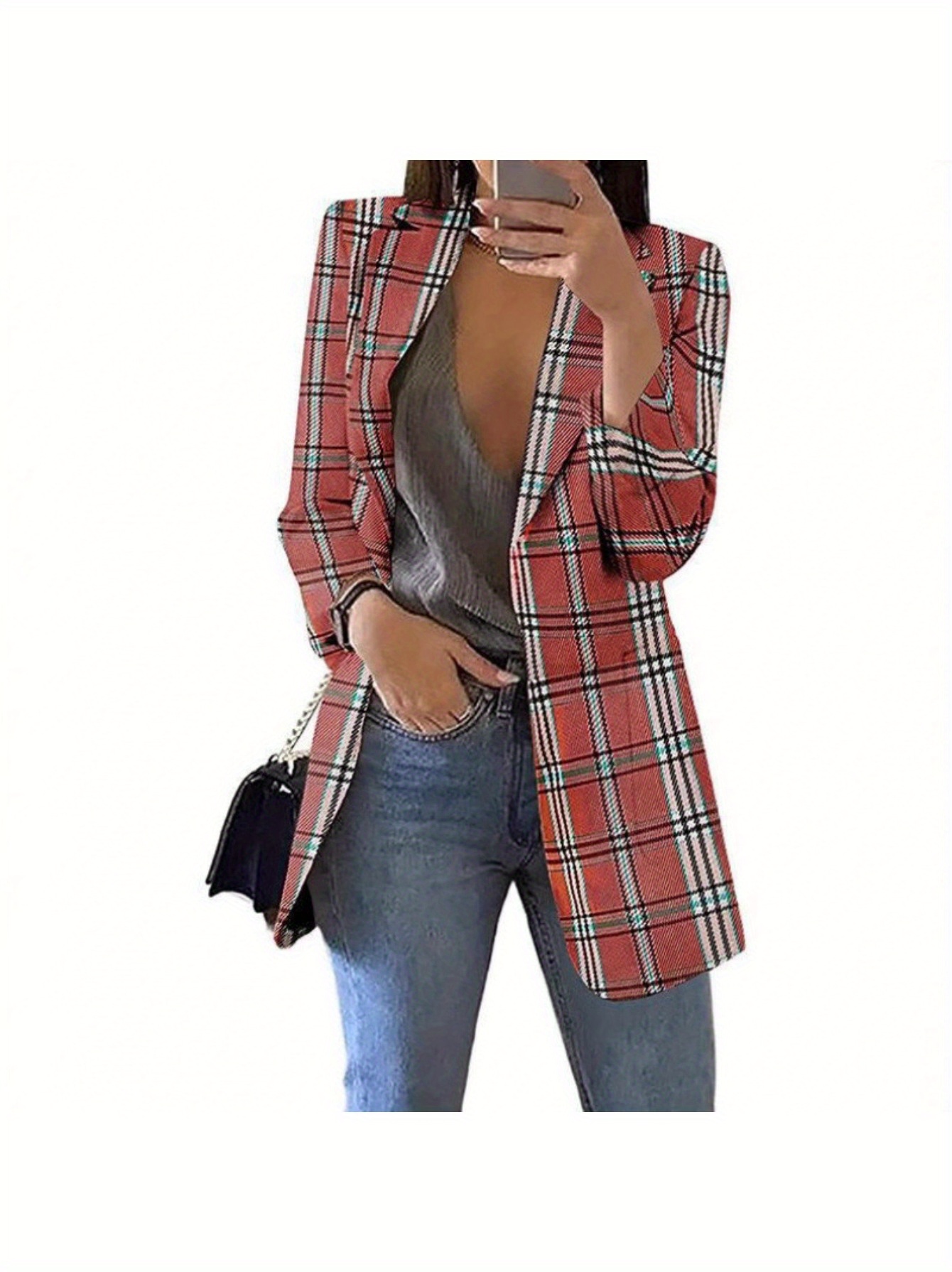 Plus Size - Plus Size, Women'S Plus Size Blazer Jacket - Vintage Red/Black/Plaid, Not See-Through Fabric, Front Opening Long Sleeve Cardigan Coat for Office, Party, Everyday - Sizes L-3XL (Curvy Women Fit) - Spring/Fall Outerwear, Party Outfit, Fall Wardrobe, Slim Fit, Durable Material, Quality Stitching, Stylish Coatigan, Women Blazer, Red Blazer For Women Plus Size, Women Plus Leopard Blazer With Pix Fur, Plus Size Blazer For Curvy Women, Business Casual Women Plus Size