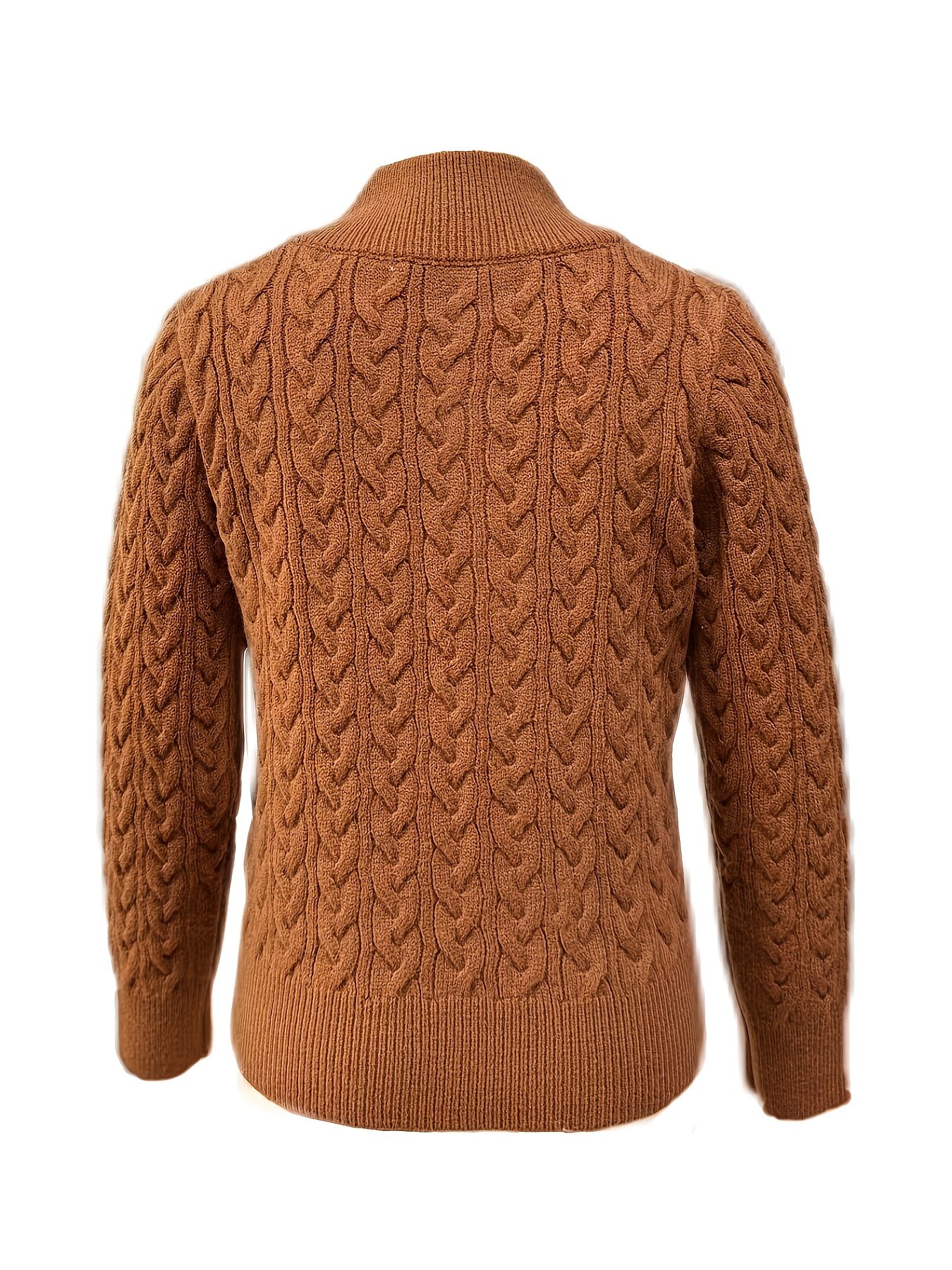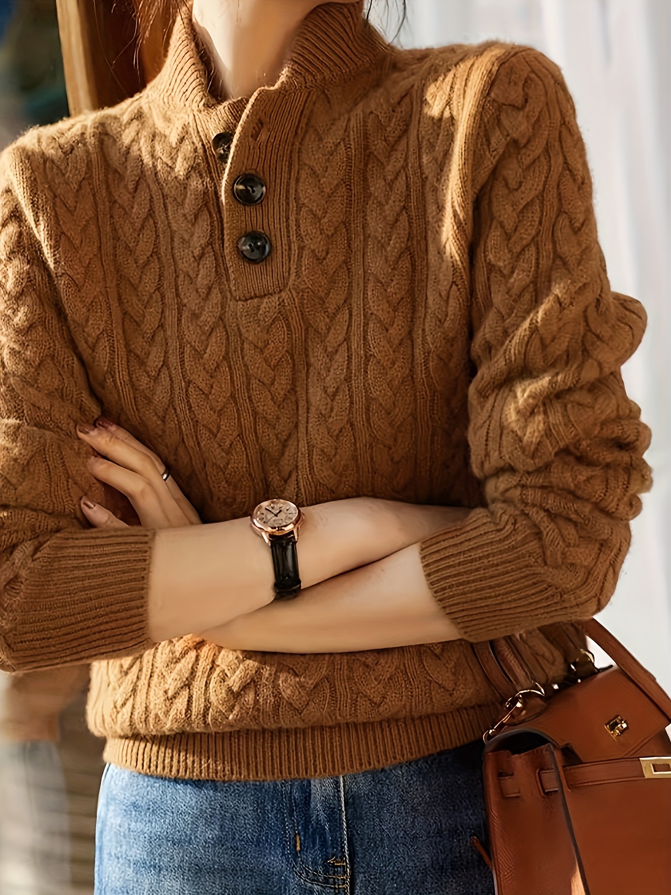 Women's Elegant Cable Sweater - Long Sleeve Pullover Sweater with Stand-Up Collar & Front Button Closure, Chic Fall Winter Sweater for Office, Party, Everyday Outfits - Women's Sweater Clothing, Office Wear, Classic Knitwear, Cozy Fabric, Working Professionals