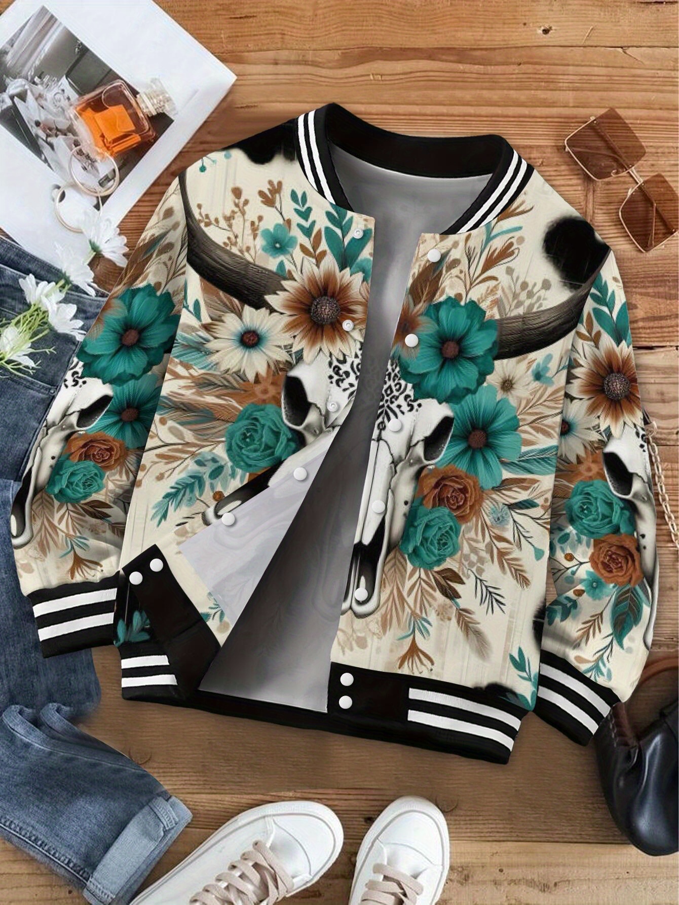 Women's Plus-Size Western Bohemian Cow Skull & Floral Print Jacket - Beige & Teal Cowboy Coat with Button Front, Long Sleeve Bomber for Country Concerts, Fall Winter Outfits - Machine Washable Outerwear